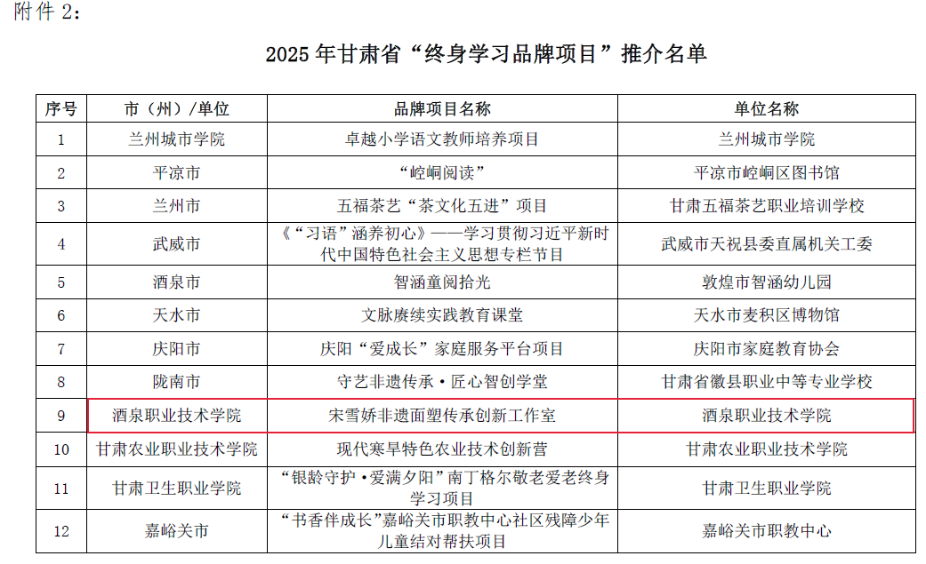 本次项目评选过程严格遵循“公开、公平、公正”原则,经部门申报、学校社区教育指导中心推介及省级评审,《宋雪娇非遗面塑传承创新工作室》成功入选2025年甘肃省“终身学习品牌项目”,成为全省终身学习领域的重要示范案例。