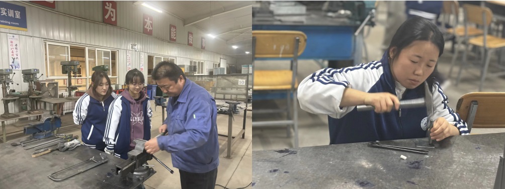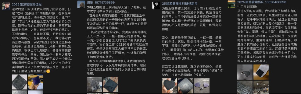在实训过程中,同学们不仅提升了个人动手能力与解决问题能力,也强化了团队协作意识。高佳妮同学感慨道:“因为有同学的帮助,我才能完成这一个作品。”从互相学习操作技巧,到共同克服困难、分享成功的喜悦,同学们在协作中深化了友谊,也体会到集体智慧的力量。此外,同学们对“工匠精神”有了更真切的体悟。杨庆同学写道:“重复的锉削、打磨虽枯燥,却磨练了我的耐心与毅力”。谢旻同学说:“每一滴汗水都包含着工人对工作的认真负责与坚守”。在亲手打造作品的过程中,学生们不仅理解了何为精益求精,更学会了在反复实践中保持专注与坚持。”杨新月同学说:“当手中的铁块最终被磨成一颗略显笨拙的爱心和一枚规整的六角螺母时,我触摸到的不仅是金属的质感,更是一种深刻的隐喻。这次实训让我懂得,真正的服务匠心,是感性与理性的完美结合,是在冷硬的“标准”框架内,打磨出最温暖‘惊喜’。