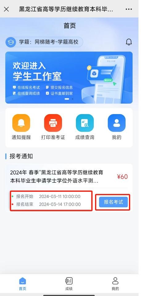 3.登录完成进入到首页,学生可看到报名信息: