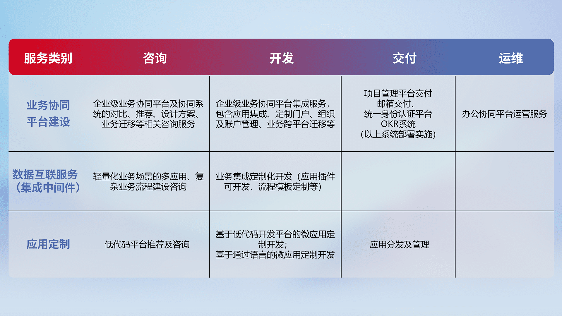 针对钉钉、、企微、、、、IDaas等平台级产品提供产品的规划、、、方案、、、、交付、、定制化开发等服务,,,,实现如统一协同办公、、、智能客户服务、、混合会议管理、、、、智能数据查询、、等业务场景,,,实现数字化转型。。。